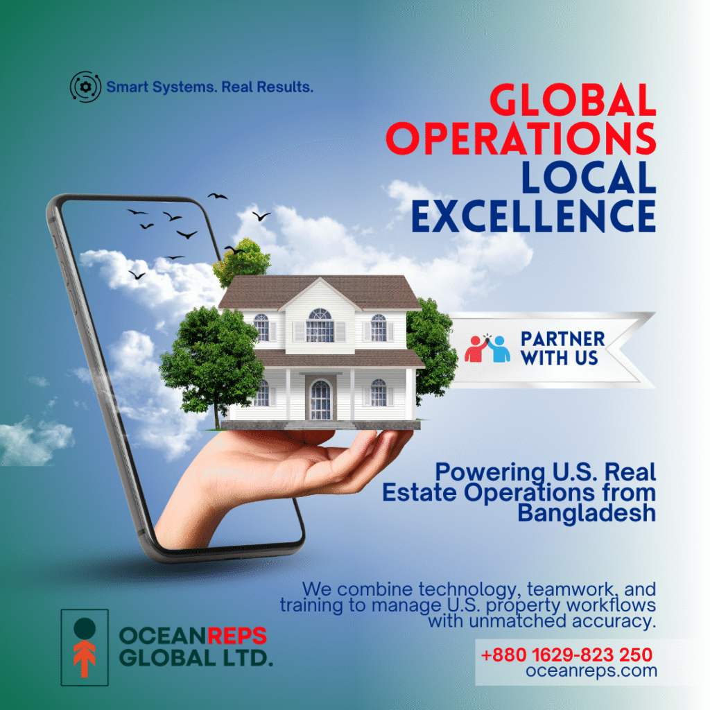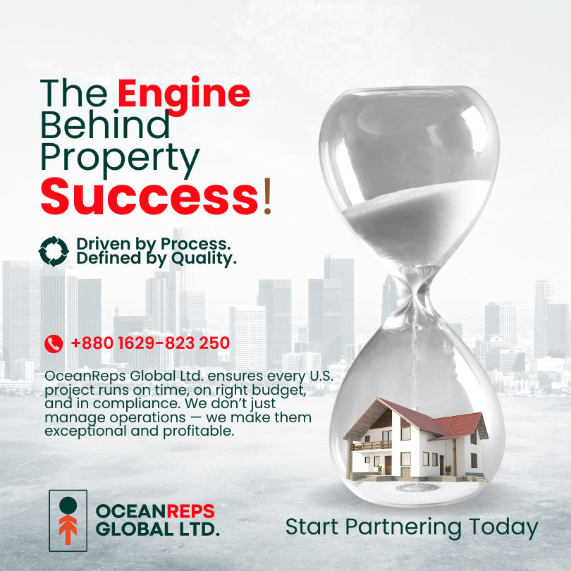 At OceanReps Global Ltd. we function as the offshore operations hub for U.S.-registered real estate and property service companies. Our team in Bangladesh manages the full operational cycle — from client coordination, vendor management and workflow tracking to quality control, compliance and financial processing. Through our U.S. entities we deliver a wide range of services including property preservation, maintenance, inspections, repairs, renovations and compliance management — ensuring each property remains secure, well-maintained and market-ready. With streamlined processes, advanced technology and skilled professionals OceanReps bridges the gap between global efficiency and U.S. operational excellence — enabling our partner companies to scale faster, perform better and serve clients nationwide. Efficient. Compliant. Scalable. Globally powered.